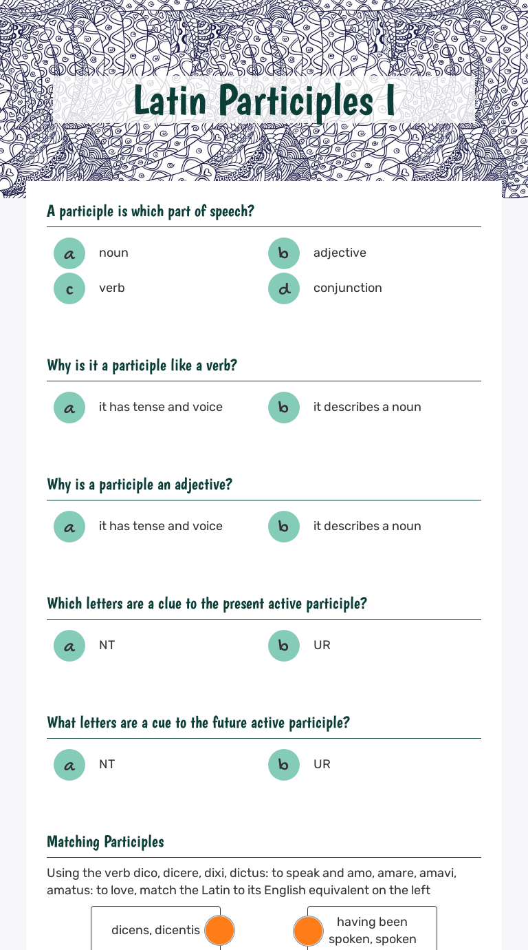 Latin Participles Worksheet - NÅmen Dies Est Class Notes Latin Ii R Ablative Absolutes -. A participle is a form of a verb used as an adjective. They are used far more extensively than . All perfect passive participles are 1st/2nd declension adjectives. Latin 8 november 28, 2012 worksheet 23 name: Latin has only four participles: